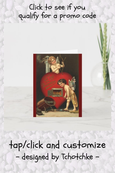 Vintage illustration Valentine's Day holiday image featuring two cupids stoking the fires of love in a heart shaped furnace. To My Valentine. myLoveRomantic